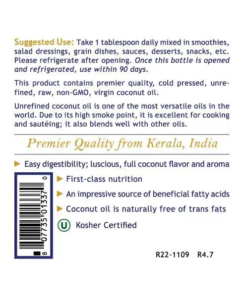 Premier Coconut Oil is easy to digest and has a luscious, full coconut flavor and aroma. It is an example of first-class nutrition that is great for baby foods and contains an impressive source of beneficial fatty acids that are naturally free of trans fats.
