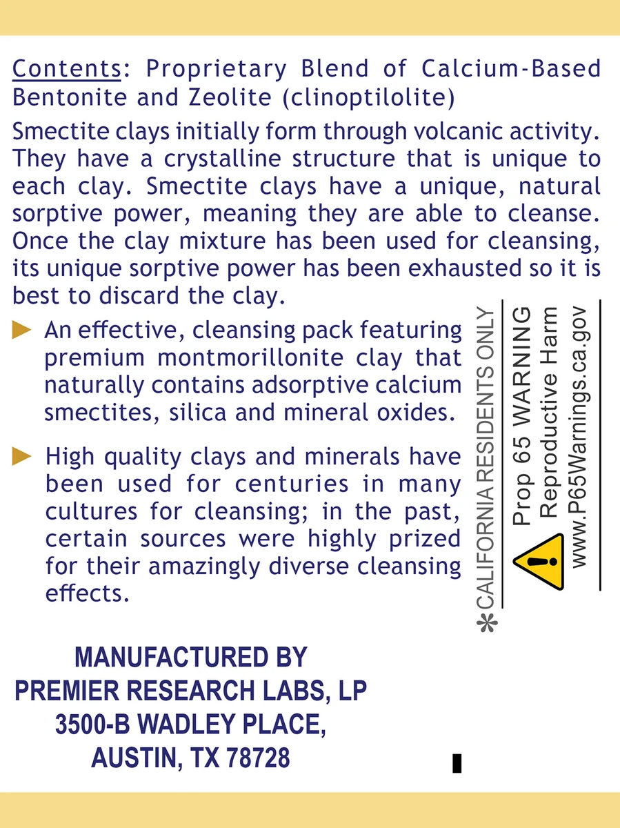 - An effective cleansing pack featuring premium montmorillonite clay that naturally contains adsorptive calcium smectites, silica and mineral oxides.