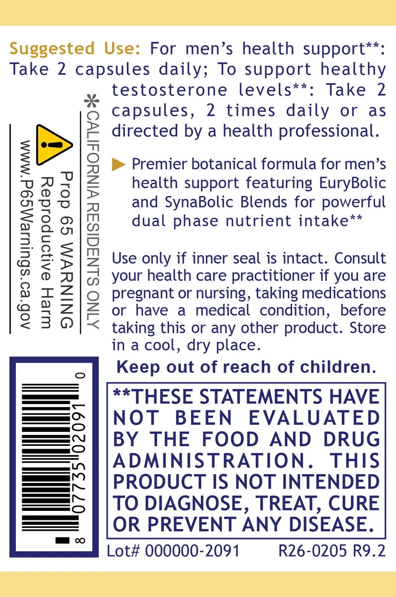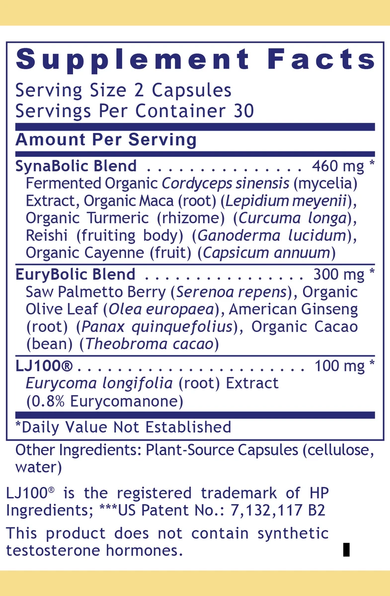 In addition to the science-backed foundation of eurycoma, this proprietary nutraceutical formula also features two key botanical support blends: EuryBolic Blend and SynaBolic Blend. Together, they supply a broad range of biocompatible botanical agents which offers a complex phytochemical profile for additional nutritional support.